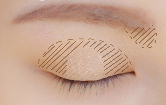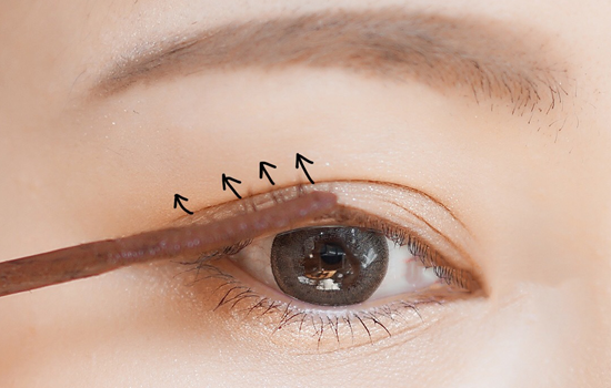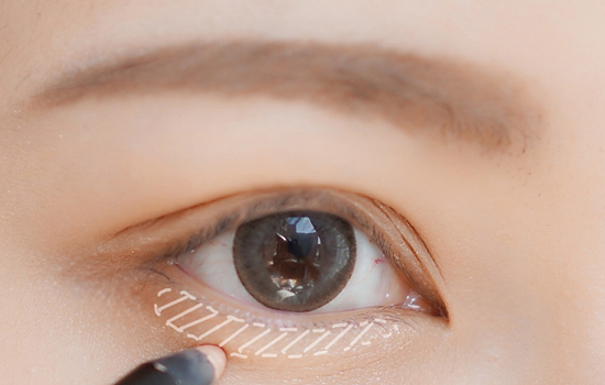 卧蚕笔珠光的一头涂抹在下眼睑,从眼头到下眼睑三分之二处,避开眼尾。用棕色的一头紧沿珠光处的底部涂抹,勾勒出卧蚕的位置。