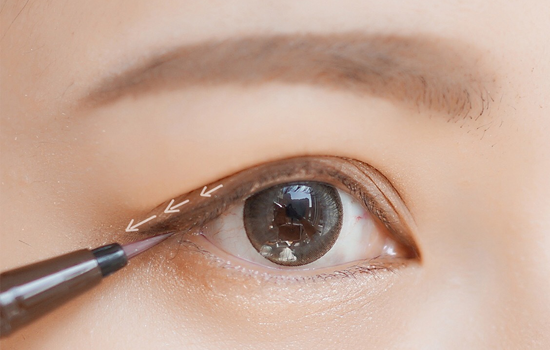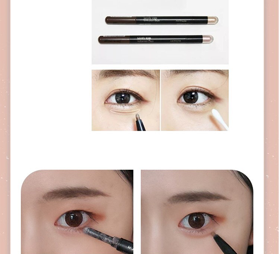 第三步:亮粉色卧蚕笔在卧蚕上画出高光部分,咖啡色眼影填充下眼睑尾巴虚线范围。这里使用的产品是爱丽小屋卧蚕笔。