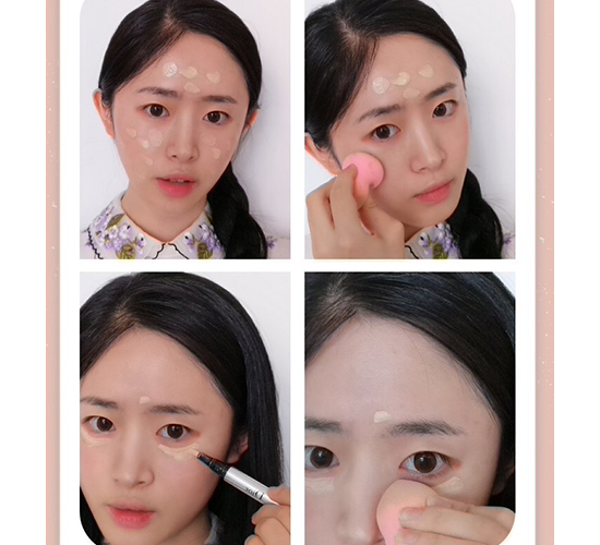 粉底液点涂在面部,用美妆蛋以按压的方式上妆推开。将遮瑕液涂抹在眼部暗沉处,用美妆蛋以点压式推开,多次少量,在鼻翼、下巴等处也同样。不要选择太滋润的遮瑕,反而会更容易脱妆。