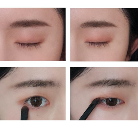 第二步:咖啡色眼影在上眼皮上大面积涂抹,作为眼部打底,最浅色轻涂在眼皮中间高光部分,眉头部分用咖啡色眼影打阴影。微笑显现出卧蚕部分,卧蚕下面用小指头涂抹咖啡色眼影做阴影。