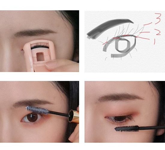 从睫毛根部开始夹起,越靠近眼皮越好,控制力度,多次后缓慢抬起。将睫毛根部分为三段,由下到上,从1到3。先涂抹白色的打底膏,增加持久度,再按Z字型开始向上刷睫毛膏。
