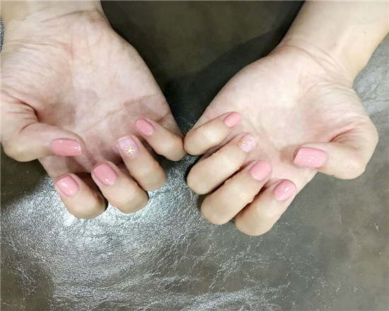 粉色美甲跳裸粉色,还加上金色的小星星,整体色调 就很搭,而且还很显白呢。