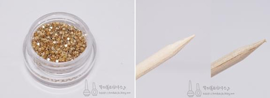 STEP4:拿出小颗粒的瓶底金色贴片,用尖头木棒作为辅助工具,没有的话也可以用尖头蜡笔。