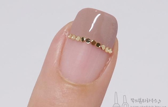 STEP5:把金色贴片依次贴在刚才的那只法式美甲的交界处,既有裸色的低调,又不乏金色的贵气。