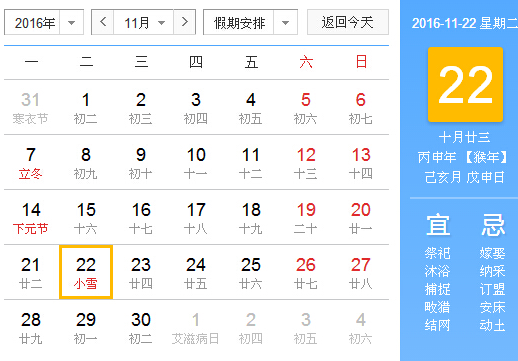 根据上图月历表显示:今年的小雪节气时间在2016年11月22日,即农历十月二十三日。这一天宜祭祀、沐浴、捕捉、畋猎、结网、扫舍;忌嫁娶、纳采、订盟、安床、动土、破土、安葬。